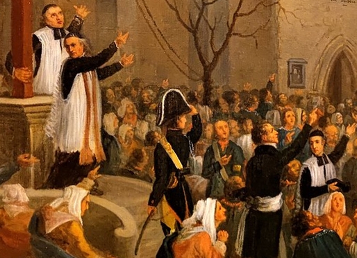 Autre lithographie de Langlumé, remplaçant celle qui avait été retirée du marché. Encore une fois la foule est massée devant le porche, et L'abbé de La Neufville s'indigne de voir la croix plus haute que le clocher.