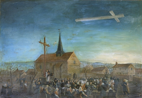 Sur cette estampe, au dessin moins fouillé, la foule est dispersée, mais la croix parait trop petite. Elle sera néanmoins reprise par Wilfrid de Fonvielle pour sa Physique des miracles.