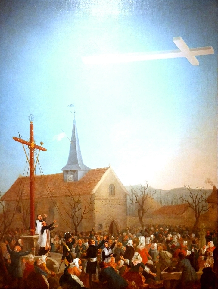 Si la foule parait correctement placée, et la croix de Mission bien proportionnée, la croix céleste est trop petite, trop épaisse, trop lumineuse et mal placée.